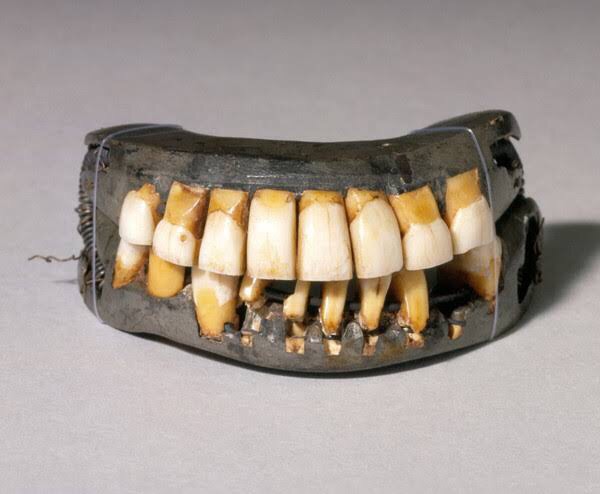 当時の入れ歯の材料は木材、鉛、骨などであったが実はプランテーションで働く奴隷の歯も使用していた。健康な奴隷の歯を抜いて使用したものもあったと言われている。入れ歯の写真も気持ち悪いが、健康な黒人奴隷の歯を抜いて使用する方がもっと気持ち悪い。現代人には及びもつかぬが、これが「建国の父たち」の人権意識であった。独立宣言を起草したトマス・ジェファーソンは、 有名な農園「モンティチェロ」に600人以上の奴隷を所有していた。(ワシントンの農園「マウントバーノン」の奴隷は300人とも言われる)