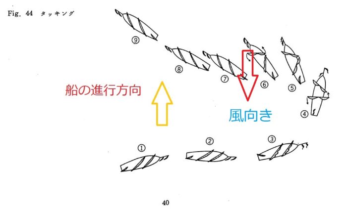 図(杉浦昭典『帆船-その艤装と航海』より)を見ればわかるように、④の時点で左前から受けていた風向きを右前から受けるように帆の位置を変える(風上に立つ)ことである。大概のヨットの場合は1本マストの主帆を右向きから左向きに変える(あるいはその反対)だけだが、帆桁が船体上で旋転し、ヨットの傾きも逆になるので初めての人には大変な作業に感じる。だが、フェートン号は3本マスト、帆の数も多く、数多くの操帆のための索が艦上に張り巡らされているから、タックは艦上の全員(士官や海兵を除く)が総がかりの作業であろう。ベンガル湾を快走しているときにはモンスーンの追い風を受けているので、タックはほとんどなかった。だが、マラッカ海峡に入ってからは連日タックが頻繁に行われるようになる。乗組員の負担は一気に倍増しただろう。日誌はタックの実施をいちいち記録している。