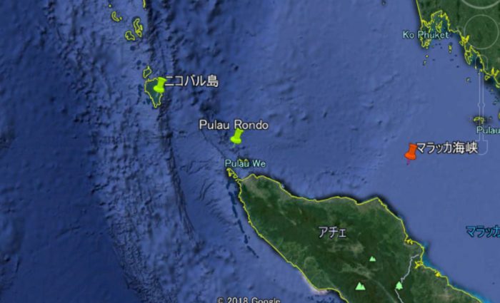 17日正午、Mizen Mast(最後部3本目のマスト)の見張りが「Land ho!」と報告した。コーターデッキ(後部艦橋甲板)の士官たちはそれぞれ望遠鏡で注視したことだろう。地図で見ると、インド洋に突き出したスマトラ島の北端にゴマのように小さな島がある。Weウェ島だ。ここはアチェン県サバン市である。そのさらに北北西26㎞にあるPulau Rondoロンド島が見えたのだ。Google Earthではぼんやりと映っているだけで島名の表記もない。既に英海軍の海図にはこの島が登録されていたと見える。このロンド島の北西157㎞にニコバル島がある。マドラスからマラッカ海峡へ直線を引けば、最短航路はニコバル島とロンド島の間を通る。フェートン号はたった6日と18時間でこの狭い水域を通り抜けた。極めて正確な航海技術である。洋上での2度の邂逅(英艦隊とアメリカ商船)もこの航路が定着していることを物語る。