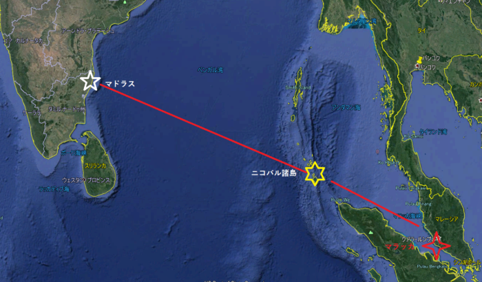 インド大陸からベンガル湾を東へ向かうと、真東の方角にはアンダマン諸島があり、南東の方角にはニコバル諸島があって、極めて有効な目印である。マドラスを出航してアンダマン諸島に向かい、そのままの航路を南東に行けばマラッカ海峡が大きな口を開けている。フェートン号はマラッカ海峡を目指しているのだ。