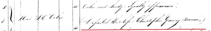 日誌には死因や年齢などの詳細はなく、Departed His Life, Christopher Garry (Seaman)とあるのみである。マドラス出航以来、病に臥せっていたのか、何らかの事故なのか、1水兵の死を調べる手立てはない。暗い湿った艦内はさらなる陰鬱さに包まれたことだろう。