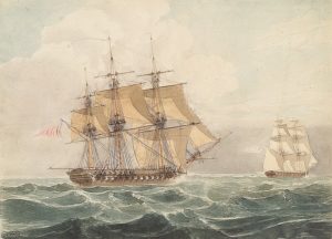 さらに翌15日朝7時、北東に再び帆を見る。8時10分に接近、二本マストの小型アメリカ商船Hileniaで、ベンガル地方を出航してフィラデルフィアへ向かっているとのこと。どうやら足の速いフェートン号が追いついたらしい。ボートを出して相手船に乗り組んでいるが、臨検だったと思われる。アメリカ船はナポレオン戦争については中立である。だがフランスの軍需物資を運んでいることもありうるからだ。そのような荷はなかったらしく艦載艇はすぐに戻り、フェートン号は9時には展帆して航海に戻った。この日は終始悪天候で操帆作業はひっきりなしに行われ、裂けた帆の修理作業も行われた。