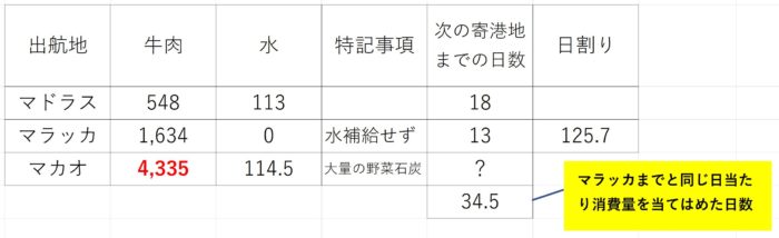 そこでマラッカに到着した時は牛肉はゼロになった、またマカオに着くまでにマラッカで積載した牛肉を全て消費したと仮定する。マラッカからマドラスまでの日数は13日なので、1日あたり125.7ポンドの牛肉を消費したことになる。この数字で4335ポンドを割ると次の寄港地まで34.5日分の牛肉を積載したことになる。マカオを出航したのが8月30日、それに34.5日を足すといつだろうか?10月3日になる。フェートン号が長崎に侵襲して薪水食糧を要求したのは10月4日である。見事に計算が合うことになる。