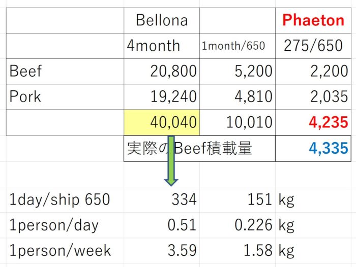 べローナは4ヶ月分の食料として牛肉を2万ポンド、豚肉を2万ポンド弱積載している。フェートン号は牛肉しか積載していないのでべローナの牛肉と豚肉を合わせたものをフェートン号と比較してみよう。4ヶ月分で4万ポンド、1ヶ月分は1万ポンドになる。これをベロナ乗組員650人に対してフェートン号の275人(フェートン号級艦の定員は250から300人である。長崎では300人と称したが敵地において 少なめで言う筈はないので300人以下であったろう。そこで250と300人のちょうど中間である275人として仮定して計算してみる)で換算するとの1ヶ月分の肉の量は4235ポンドになる。マラッカで積載したのは4335ポンド、これもピタリと合う数字である。