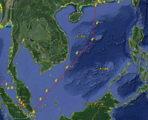 マラッカ海峡は静かな海である。西の対岸にはスマトラ島があり(もちろん肉眼では見えない距離にある)、東のマラッカ側にはマレー半島があるので風は弱い。フェートン号は穏やかな海面をマレー半島南端を目指して南下する。出航の28日から深夜の2時や3時に搭載した水牛の屠殺が行われた。6日間にわたって毎日2頭ないし1頭を深夜2時から3時ごろに殺し、計1,634ポンド、741㎏の精肉を得た。乗組員一人当たり2㎏を超す量である。赤道はすぐ南の炎天下なので殆どが備蓄用に塩漬けにされただろうが、出航以来3週間、休日もなく働かされマラッカでの上陸機会も無かった水兵たちにボーナス的に新鮮な肉料理が振舞われたことだろう。