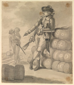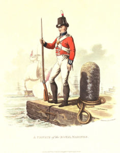 Marine海兵とは、戦闘時には小銃や銃剣などの武器で戦う戦闘専門要員であるが、平時には艦長の命令のもと艦の治安を担当する。乗組員の叛乱Mutinyがあれば、叛乱鎮圧にあたる艦上の警察要員となる。だが海兵であっても酒の誘惑には勝てなかったのだろう。