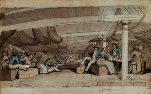 売春宿はマドラスを出航して以来ほぼ50日、上陸の機会すらなく女の影も見なかっただろう。酒と肉は、当時のイギリス本国の貧困階級では軍隊にでも入らなければ滅多にお目にかかれなかったに違いない。そういうわけで、前述の海軍本部食料規定にもビールの配給目安が明記されている。誰も希望者がいない軍艦の水兵を徴募するにはそれが最高のインセンティブだからだ。ちなみにイギリス海軍の伝統をついだ旧帝国海軍は大量の日本酒を積載していたのはご存じのとおりである。が、アメリカ海軍は一切アルコール類の持ち込みを認めない。余談ではあるが私が最も評価するミッドウェー作戦参加者の記録” Crossing the line” によれば爆撃機の爆撃照準器に100%の純粋アルコールが使われており、古参下士官がこれを盗み飲みしていたと言う話が載っている。