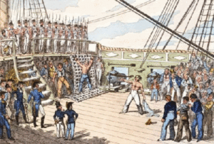 ではこの鞭打ち回数はどのようにして決めたのだろうか。それは艦長の決裁事項である。艦長はあらゆることの権限を持つ全権者である。したがって艦上の独裁者とも呼ばれる。この場合の鞭打ち回数は私には多めに感じられる。 盗んだ酒の量からして常習犯 と見られても仕方がないし艦内に 盗まれた酒を飲むネットワークがあったのかもしれない。それにしても最低が18回最高で36回というのは軽い量刑とは思えない。鞭打ち刑といってもそういう処刑を採用した経験していない日本人が想像するような生やさしいものではない。ロープに結び目をつけ、屈強な鞭打ち執行者が全身の力を込めて被処刑者の背中に叩きつけるのである。皮膚が破れ、何度も続くと肉が露出する。現代社会で今も鞭打ち刑を執行している国がある。シンガポールである。私が駐在時代、私の運転手は私より数歳若かった。彼は若い頃不良というかちょっとワルだったらしく、その時のワル仲間がこの鞭打ち刑にあったというのだ。その男はあの刑を受けるほどなら二度と悪さをしないと常々言っていると、運転手はよく話してくれた。2000年当時の話である。なぜシンガポールが現代社会でも鞭打ち刑を残しているかについては余談になるので、下の欄外に記しておく。