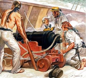 午前9時過ぎ晴天で気持ちの良い追い風を帆走中、“Man the station” (総員戦闘配置につけ)と後部コーターデッキに立つペリュー艦長がメガホン越しに叫んだことだろう。早調子の太鼓が鳴り響きBoatswainボースンの鋭い笛が水兵たちを持ち場へ駆り立てる。ナイトシフトを終えハンモックで寝ていた水兵も大慌てで起きるとハンモックを畳んで低い天井に括り付ける。36ポンド砲の舷側砲門が一斉に開かれ、Gunner砲手を始めとした砲側の要員は巨大な黄銅砲の固縛を解き、砲門から砲身を突き出す。Powder monkeyパウダーモンキーと呼ばれる10代の少年たちが船底の火薬庫に駆け降りビルジ(船底に溜まる汚水)の悪臭の中を火薬袋にPowder火薬を詰め込み、ガンデッキ(大砲が並ぶ甲板)に運び込む。Marines海兵たちはマスケット銃に弾込めをして持ち場につく。