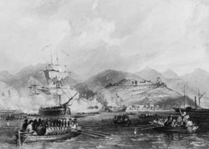 当時イギリス東印度会社は中国貿易で巨大な赤字に悩んでいた。中国からは絹、漆器、茶などを大量に輸入していたが、その決済は全て銀で行われた。だがインドからは中国に輸出される産品が何もなかった。そのため大量の銀が中国に流出していたのである。そこで目をつけたのが中国で流行り始めていたアヘンである。中国に最初にアヘンをもたらしたのはオランダ人であったが、18世紀後半インドでのアヘンビジネスを完全独占したイギリス東印度会社はその輸出先を中国に狙いを定めたのである。アヘン密輸業者の中国人からは銀で支払いを受けるためアヘンを輸出することによって銀の大量流出が逆に銀の獲得につながっていくのである。このビジネスは大成功し年間1000トン以上のアヘンを輸出することになった。19世紀前半中国の沿岸部を中心に1千2百万人の中毒者がいて、中国全土で4人に1人の中毒症状だったと言う。清王朝はこれを憂慮し何度も禁令を出したがアヘンの密輸は止まらず、ついに1839年実力行使に出る。広東のイギリス東印度会社の商館員や商船を拿捕したのである。これに憤激した広東のイギリス東印度会社の代表はすぐに英海軍の軍艦を呼び寄せて実力行使に出る。これでわかるようにイギリス東印度会社はイギリス海軍を自分の利益のために行動させる権限があるのである。イギリス海軍は国王陛下(当時はビクトリア女王=在位1837年から1901年)の海軍であるが(HMS: Her [国王が男の場合はHis〕Majesty’s Shipがすべての軍艦の名前の頭につく。フェートン号も正式名称はHMS Phaetonである)イギリス東印度会社にとってはインド以東においてはイギリス東印度会社そのものが国家であり、軍隊を持ちかつ女王陛下の海軍を運用できたのである。