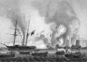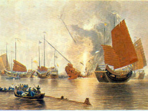 いざ戦闘が始まるとたった1隻のインドから派遣された軍艦と数百名の部隊に清王朝の軍船も陸上部隊も敗北に次ぐ敗北を重ねた。イギリス側の損害はほとんどゼロであった。これは兵器の(小銃や大砲)の性能差もあるし、また清王朝軍兵士の戦意が著しく低かったせいもあろう。しかしこれを現地の指揮官は北京へ我が軍の大勝利と言う報告をしたのである。あらゆる戦闘でそういうことが行われたらしい。このことは北京の宮廷の判断をすっかり狂わせることになった。インドからさらに増援が届くと瞬く間に清王朝軍は総崩れとなっていく。こうして第一次アヘン戦争は終わり香港が割譲され領事館も設置されることになった。
