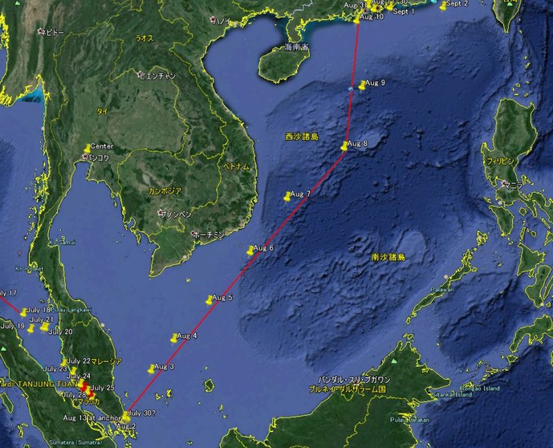 これは船の水漏れをしているところに埋め込んで浸水を防ぐのである。またこの日は珍しく朝7時になって水牛二頭を屠殺している。作業は昼食をはさんで夜まで続き、午後8時には陸地から得た木材で船底の反り返り修復作業を行っている。 翌2日、いつものように朝3時に最後の2頭を屠殺している。船底修復作業はこの日も続き、大量のフジツボを船底から掻き落としている。 製帆手製縄手船匠長は連日の作業を引き続き行い、総員が昼食まで手伝っている。10時半に全ての帆を展張して出航した。南シナ海に入ったせいか時折激しいスコールが降って縮帆したり展張したりと作業も忙しい。3日、マレー半島から200km離れた海上を北上する途上、マドラス出航以来初めての戦闘訓練が行われた。“Exercised Great Guns & small Arms: fired at a Target”