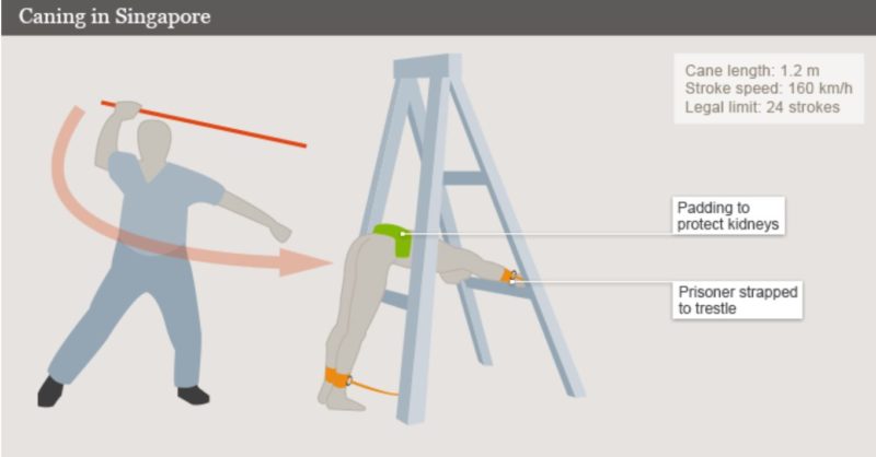 ちなみに、私がシンガポール駐在当時、アメリカ人のハイティーンの少年がいろんな車にペイントスプレーをかけるという事件が起こった。シンガポールでは車を1台購入するのに数百万円の税金がかかる国である。それだけにこれは重罪と判断され、鞭打ち刑が宣告された。これに対し、当時のブッシュ大統領はこの宣告を外交問題化し、国務省が人道問題ということで精力的に動き、結局この少年はアメリカに追放処分ということになったが、これはシンガポールの鞭打ち刑というのは恐ろしく残虐な行為であるということが世界の常識になっていたからである。