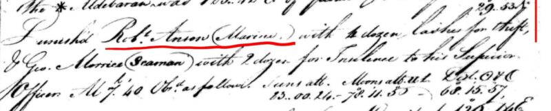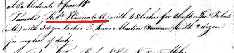 因みに9月1日の海兵Rob Hansonと、9月15日の海兵Robert Ansonは同一人物かとも思えるが、航海日誌にははっきりとHanson とAnson が明記してあるので別人だろう。几帳面なStockdaleが2週間後の処罰で名前を間違えるというのは考えにくいからだ
