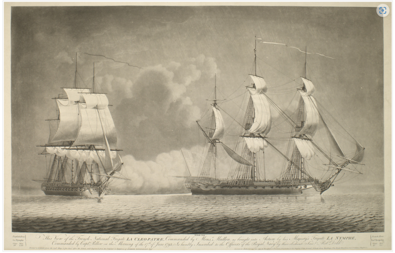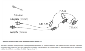 Cléopâtreクレオパトラとの舷と舷を接する海戦(Broadside)は1時間半ほどに及び、Cléopâtreの帆柱は砲撃で撃ち倒され、CléopâtreのMullon艦長始め両艦の戦死者負傷者が113人にも及ぶ凄惨な戦闘だったが、エドワード・ペリューはかすり傷一つ負わず、彼の不死身の伝説が生まれることなる。