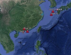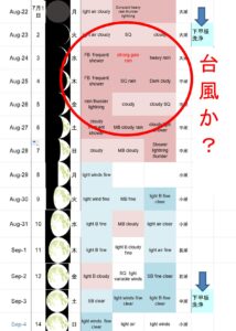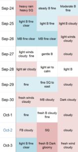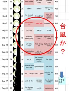 8月24日から27日にかけての4日間、連日強風が吹き荒れ、大雨や雷雨に見舞われている。中でも24日のstrong gale(ボーフォートの風力表では12段階の9番目。風速24ⅿ前後)は全航海中、初めての表記である。同じような気象が9月8日9日前後に起こっている。この2期間は台風の可能性が非常に高いといえる。恐らく艦の隅々まで水浸しになったであろう。これが9月3日や17日の下甲板洗浄を行った原因と思えるのだ。