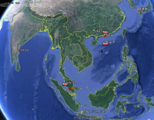「その③船内の洗浄回数が増えた」を検証しよう。上甲板近くに居住する士官や下士官と違って、水兵たちの多くは下甲板近くに居住する。当然、悪臭に近いし不衛生でもあるから下甲板の洗浄が必要になる。作業の詳細は分からないが、排水ポンプで汚水を吐き出し、海水で洗浄するのだろう。この作業は航海の前半ではほとんど行われなかった。その分の溜まった汚水洗浄をマカオ停泊中に3日もかけて徹底的にやったのだが、長崎沖を遊弋中の9月17日と長崎襲撃直前の10月1日にも洗浄を行っている。下の地図の⚓のマークが洗浄を実施した日と場所である。