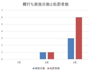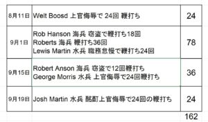 さらに台風などの雨による生活環境の悪化、日々の訓練負荷の増加による乗組員たちの疲労に加え、水の制限という苦難が始まったのである。マカオで連日のように水を補給したフェートン号は、マドラス出航時の113トンを上回る114.5トンの水を積載している。恐らくこれが満載に近い数字なのだろう。因みに杉浦昭典名誉教授によると、トンTonとはフランス語のTunが語源で、このTunは樽を叩いた音から生まれた言葉だという。1トン樽を使用して、バラスト(おもり)代わりに船底に115本ほどの樽を並べていたのだろうと想定される。マカオを出てから樽の水漏れが数日にわたって発見されコウキン工が修理にかかっている。マカオで水を満載したという安心感だろうか、水の消費も9月2日と3日は1日2トンの水を消費した。そこで9月10日から1日1トンの水消費の節減が始まった。乗組員にとっては1日わずかブリキ缶にして6杯の制限がかかったのである。9月という季節、重労働の毎日、来るべき戦闘への緊張感、そして水の不足。これは何をもたらすか。士気の低下、風紀の紊乱、である。水兵たちの不正行為が目につき始める。それを示すのが、鞭打ち刑の実施である。マドラスを出航してマカオに着くまでの1ヶ月間、鞭打ち刑は一度も行われていない。しかしマカオ到着後の8月11日に最初の鞭打ち刑が行われ、9月に入ると3度も行われ、処罰者も増える。下記の図表で一目瞭然である。