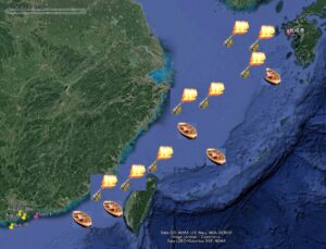 台風の強烈な風雨は艦上艦内いたるところを水浸しにしたことだろう。狭い艦内に所狭しと吊り下げられたハンモックも水浸しで、非当直時間にようやく就寝にありつけても気持ち悪いねぐらであったろう。そこへさらなる負荷が水兵達にのしかかった。戦闘訓練と上陸のための整備作業である。マドラスからマカオを出航するまでの52日間で小火器(マスケット銃など)や大砲を使った戦闘訓練は、マドラス出航直後の7月13日とシンガポール島を回って南シナ海に出た8月3日以来である。それがマラッカを出航して目的地が日本と明示されたのは9月2日(「14 マカオへ」を参照)。そこから戦闘訓練の回数が一気に増加するのだ。日本はイギリスの敵フランスの属国であるオランダに貿易を許可しており、イギリスには国を閉ざしている。いわば準敵性国家と言ってもよいことを乗組員はわかっていただろう。その国の近海でオランダ船を攻撃拿捕するか、最悪は長崎港を襲撃してオランダ船を拿捕する。日本側の反撃は当然予測せざるを得ない。となると訓練も緊張感溢れたものになった筈である。マストトップの見張り員の「オランダ商船発見!」の叫び声とともに、コーターデッキ(艦長らが蝟集する船尾の一段高いデッキ)から艦長もしくは副長がメガホンで「総員配置につけ!」の命令が飛び、ボースン(水夫長)の鋭い警笛が水夫たちの行動を指示すると、大砲に取りついた砲兵は開け放たれた舷窓から砲口を突き出し、パウダーモンキーと呼ばれる少年たちは船底から火薬袋を抱えてラッタル(階段梯子)を駆け上り、海兵(マリーン)たちはマスケット銃に弾丸と火薬を装填して持ち場につく。艦上艦内が一気に火事場のような騒ぎになるのである。数門の大砲が轟然と咆哮して砲弾を発射すると着弾点と距離を確認して、ようやく演習が終わりとなる。それに加えてボート類の整備が加わった。カッターやランチなど積載ボートは、商船への乗り組みや長崎港内での行動に使われるので綿密な整備が欠かせない。近接戦闘に備えてカロネード砲(散弾を発射する小型の砲)の取り付けも行った。その訓練の場所は、台湾海峡の第2哨戒区域、東シナ海の第3哨戒区域、長崎沖合の第4哨戒区域で行われたが、それを表示したのが下の図である。マラッカまでの日々とはがらりと変わった厳しい日々が続いたのだ。乗組員たちの負荷の増加は下の表でも明らかである。