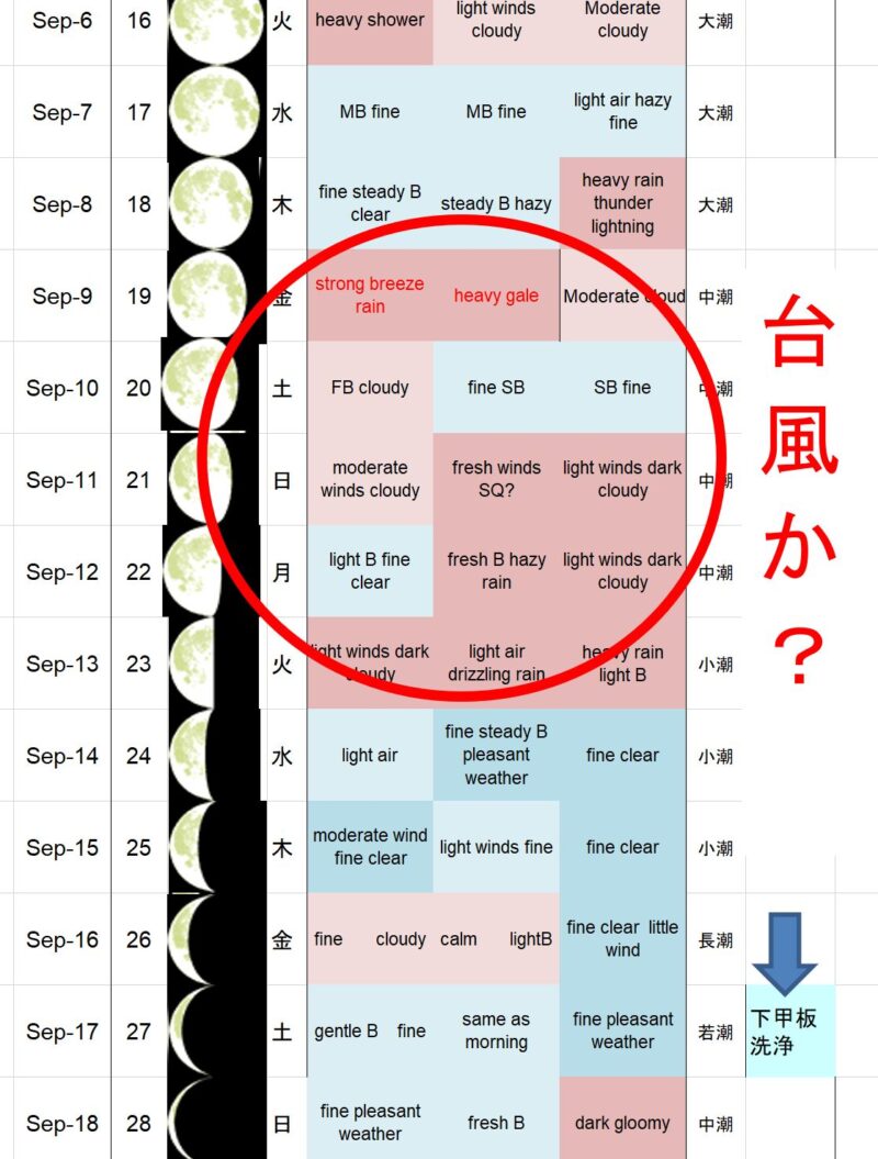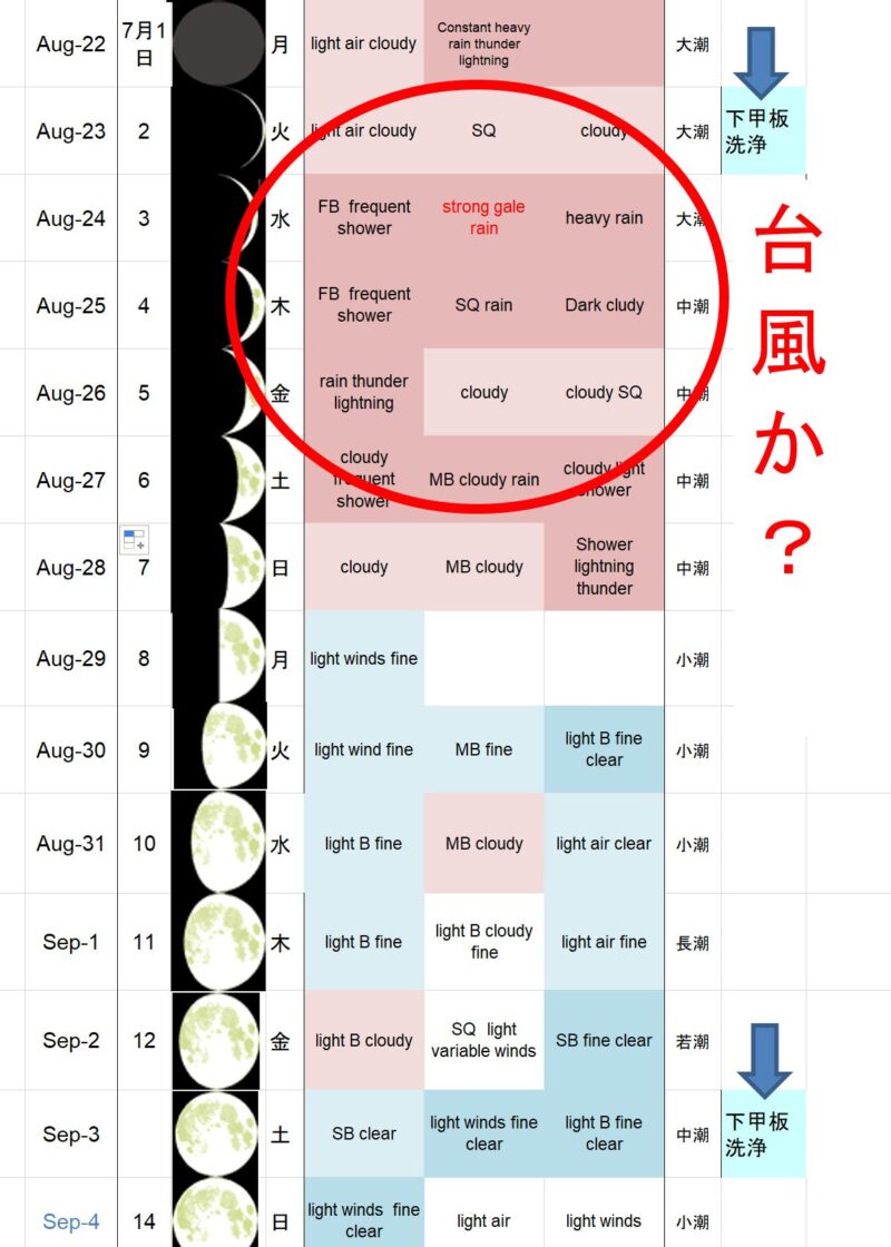 8月24日から27日にかけての4日間、連日強風が吹き荒れ、大雨や雷雨に見舞われている。中でも24日のstrong gale(ボーフォートの風力表では12段階の9番目。風速24ⅿ前後)は全航海中、初めての表記である。同じような気象が9月8日9日前後に起こっている。この2期間は台風の可能性が非常に高いといえる。恐らく艦の隅々まで水浸しになったであろう。これが9月3日や17日の下甲板洗浄を行った原因と思えるのだ。