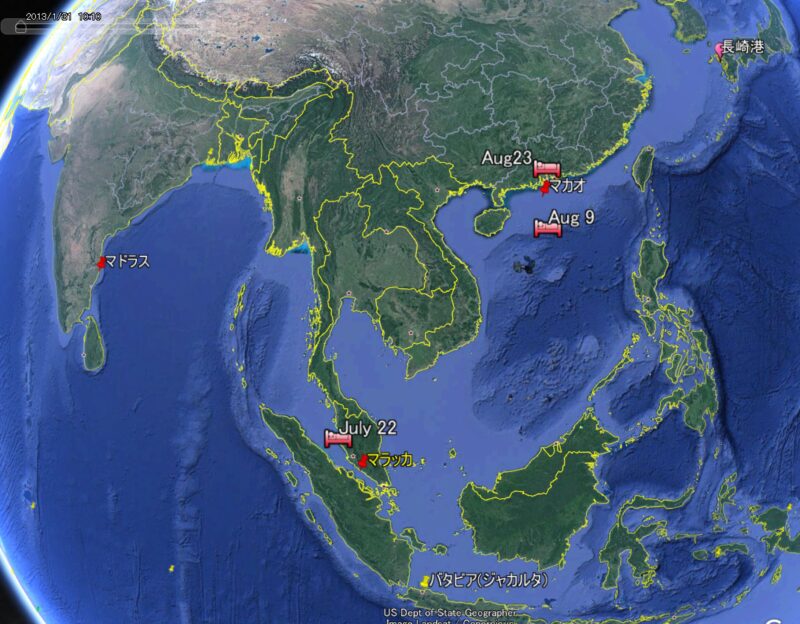 航海日誌を分析すると、さらに面白い事実に気づく。死亡者の発生である。マドラスからマカオ停泊中の8月23日までの44日間で、3人の病死者が出ている。下図の