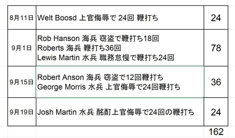 さらに台風などの雨による生活環境の悪化、日々の訓練負荷の増加による乗組員たちの疲労に加え、水の制限という苦難が始まったのである。マカオで連日のように水を補給したフェートン号は、マドラス出航時の113トンを上回る114.5トンの水を積載している。恐らくこれが満載に近い数字なのだろう。因みに杉浦昭典名誉教授によると、トンTonとはフランス語のTunが語源で、このTunは樽を叩いた音から生まれた言葉だという。1トン樽を使用して、バラスト(おもり)代わりに船底に115本ほどの樽を並べていたのだろうと想定される。マカオを出てから樽の水漏れが数日にわたって発見されコウキン工が修理にかかっている。マカオで水を満載したという安心感だろうか、水の消費も9月2日と3日は1日2トンの水を消費した。そこで9月10日から1日1トンの水消費の節減が始まった。乗組員にとっては1日わずかブリキ缶にして6杯の制限がかかったのである。9月という季節、重労働の毎日、来るべき戦闘への緊張感、そして水の不足。これは何をもたらすか。士気の低下、風紀の紊乱、である。水兵たちの不正行為が目につき始める。それを示すのが、鞭打ち刑の実施である。マドラスを出航してマカオに着くまでの1ヶ月間、鞭打ち刑は一度も行われていない。しかしマカオ到着後の8月11日に最初の鞭打ち刑が行われ、9月に入ると3度も行われ、処罰者も増える。下記の図表で一目瞭然である。