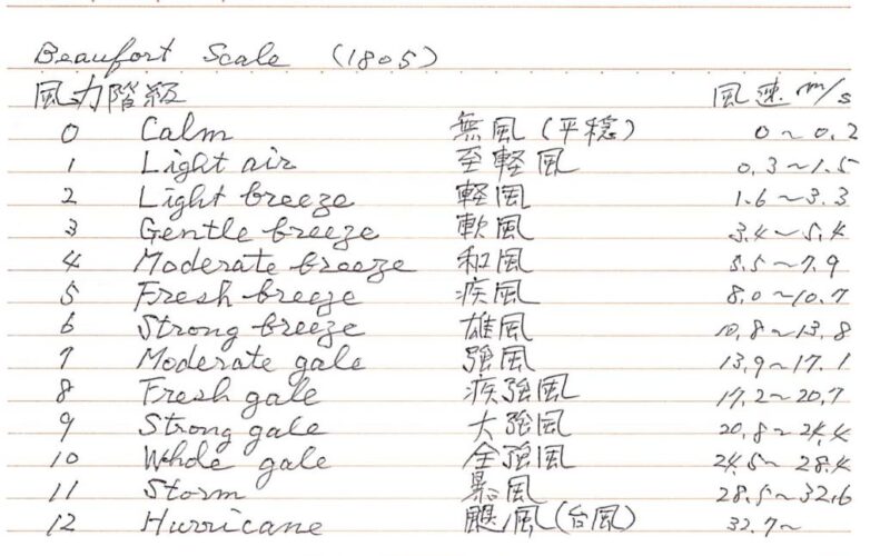 これには長い航海の他にもう一つの理由が見え隠れする。時は秋、9月である。東シナ海から日本にかけて台風の季節である。8月にマカオに着き、10月初めは長崎沖にいたフェートン号が台風に遭遇しない筈がない。日誌には常に風力と風向きの記述があるが、これを解析するとマカオ停泊中と長崎沖遊弋中に台風に遭遇した可能性が大きいのだ。日誌の午前午後夜の風力を記録した表を参照してほしい。因みに英海軍に1838年に制式採用された風力表の策定者Sir Francis Beaufortフランシス・ボーフォート卿は1800年当時このフェートン号に乗り組んでいた士官でマラガの海戦で重傷を負っている。1805年にこの風力表を発表した。後にRear Admiral提督、Sir卿となっている。杉浦名誉教授に敬意を表し、氏の手書きの表とBeaufortの像を下に掲載する。フェートン号の航海日誌(1808年)はこの風力表に基づいて記録されている。
