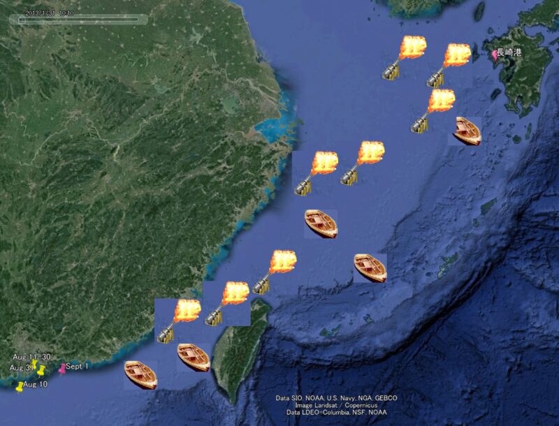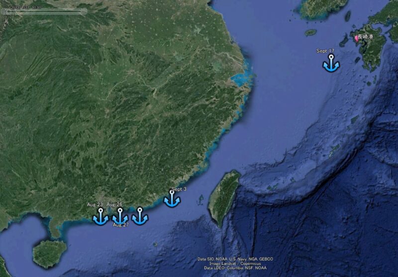 「その③船内の洗浄回数が増えた」を検証しよう。上甲板近くに居住する士官や下士官と違って、水兵たちの多くは下甲板近くに居住する。当然、悪臭に近いし不衛生でもあるから下甲板の洗浄が必要になる。作業の詳細は分からないが、排水ポンプで汚水を吐き出し、海水で洗浄するのだろう。この作業は航海の前半ではほとんど行われなかった。その分の溜まった汚水洗浄をマカオ停泊中に3日もかけて徹底的にやったのだが、長崎沖を遊弋中の9月17日と長崎襲撃直前の10月1日にも洗浄を行っている。下の地図の⚓のマークが洗浄を実施した日と場所である。