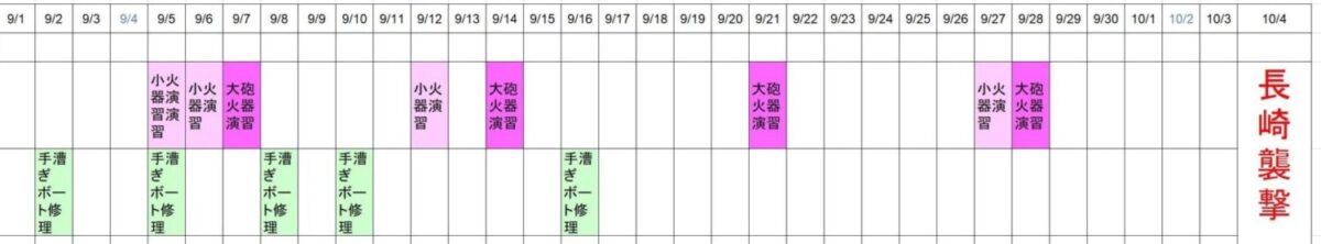 マカオを出航したのが、8月31日。既にマドラス出航から50日が経過した。マカオには20日あまり滞在したが、補給と修理作業に明け暮れて、水兵たちが休暇はおろか上陸を許された気配もない。前章で見たが、マカオ出航後は戦闘訓練や乗船上陸行動に関わるボートの整備に明け暮れる日々が続く。その影響と思えるものを日誌から紐解くことが出来る。