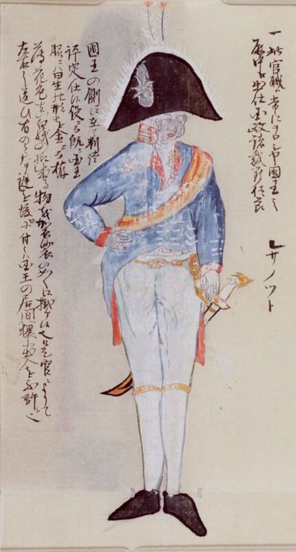 『金の垂れ飾りのある青い上着に、ローズ形ダイヤをつけた勲章帯、右胸に星、上着の背の左の結び目に金の鍵をつけた』とある。上質の羅紗の服であったろう。堂々としたロシア使節としての正装である。さらに『騎士にしてロシア阜帝陛下の侍従レザノフであると告げ、同時に私に、彼が私宛ての書面を持っているが、しかし彼はそれを私に日本人がいないところで渡すように注意しなければならないと命ぜられている、と告げた。』