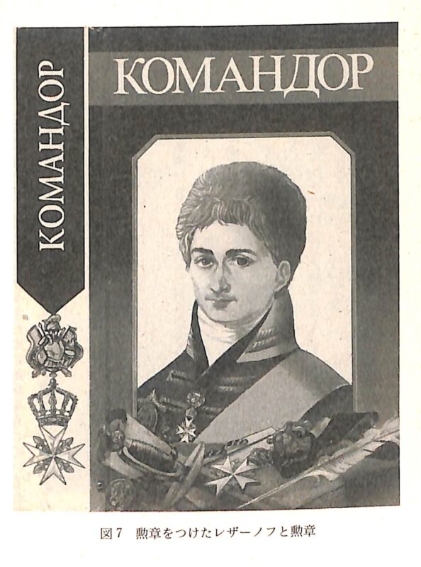 『乗船すると船長が甲板で私を迎え、下の船室に導いた。その場には検使たちがソファに坐っており、その側に、金の垂れ飾りのある青い上着に、ローズ形ダイヤをつけた勲章帯、右胸に星、上着の背の左の結びに金の鍵をつけた、一人の人物が椅子に坐っていた。そして彼は、私が検使たちに挨拶をした後に、私に、騎士にしてロシア阜帝陛下の侍従レザノフであると告げ、同時に私に、彼が私宛ての書面を持っているが、しかし彼はそれを私に日本人がいないところで渡すように注意しなければならないと命ぜられている、と告げた。私はすぐに閣下に無事な到着を祝し、彼にいくらかのお世辞を一言い、それに対して折り返し私に答礼があった。私が閲下とこんな風にしているので、検使たちは私に、今彼らと一緒に尋問を始めようと、要求した。そこで、私はすぐにそれに同意し、こうして尋問は始まった。』