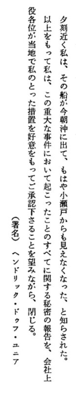 ここに上述したようにわれわれが160年もの間享受してきた特権、すなわち、他のヨーロッパ国民排除のもとで当地で自由に通商することを、閣下によって許されているという点を、閣下に忘れていただきたくない、と。私が当地での5年間の滞在の聞に日本国民の誠意について得た認識は、私に閣下がオランダ人がかくも長く保持して来た特権を縮小されるようなことはないだろうと確信させます。