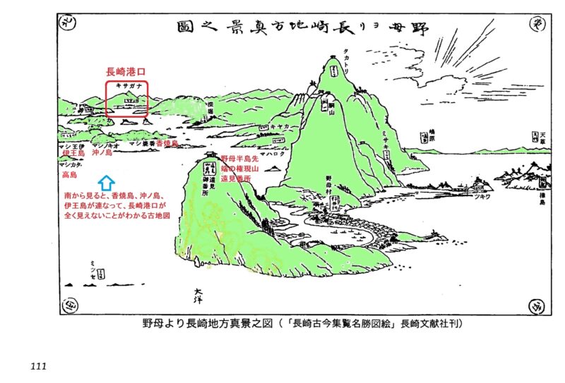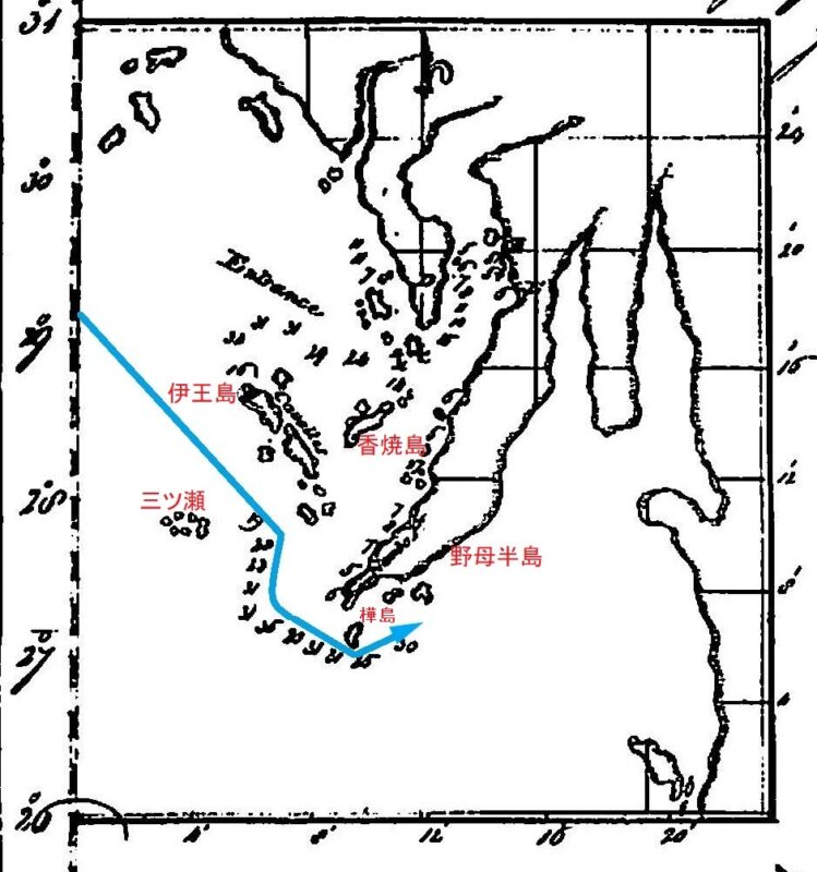 それによると三ツ瀬という岩礁(今は海釣りの名所のようだ)と端島(世界遺産軍艦島)の中間(両島の距離2km)で進路を真南に取り、野母半島の南端を通過して千々石湾に出たようだ。恐らく野母半島南端を高鉾島と勘違いし、そこを通過すれば長崎港が見えると思ったのだろう。だがそこには長崎港はなく、広い海原と島原半島に聳える雲仙岳が遥か彼方に見えたのだった。